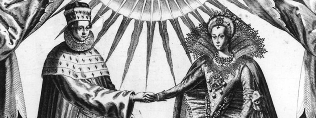 C2A-Teaser „Über das Projekt“ auf der Startseite: farblich veränderter Ausschnitt aus: Widmungsblatt: Vermählung des Kurfürsten Friedrich V. von der Pfalz mit der Prinzessin Elisabeth von England, anonymer Kupferstich von 1613. Verwendung mit freundlicher Genehmigung des Germanischen Nationalmuseums Nürnberg.
